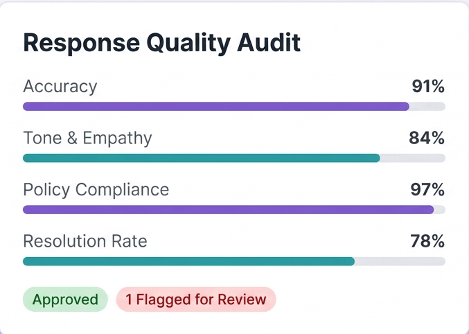 Absolutely. The Quality Auditor scores both bot and human agent responses across accuracy, tone, policy compliance, and resolution effectiveness. For human agents, this gives team leads an objective, continuous view of performance without relying on manual spot-checks or infrequent QA reviews. Flagged responses can trigger coaching alerts directly in Zendesk, and aggregate scores feed into team-level dashboards so managers can spot patterns and run targeted training.